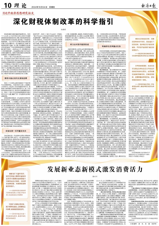 10月24日,《经济日报》理论版刊发教育部习近平新时代中国特色社会主义思想研究中心特约研究员、我校校长马海涛教授署名文章《深化财税体制改革的科学指引》。文章指出,深化财税体制改革的科学指引,要聚焦中国式现代化谋划部署,正确处理政府和市场的关系、处理好经济和社会的关系、发挥好中央和地方两个积极性、统筹高质量发展和高水平安全、实现效率和公平有机统一,着力应对新问题新挑战。文章还指出,明确深化改革重点任务,需要健全预算制度、健全税收制度、完善财政体制。
