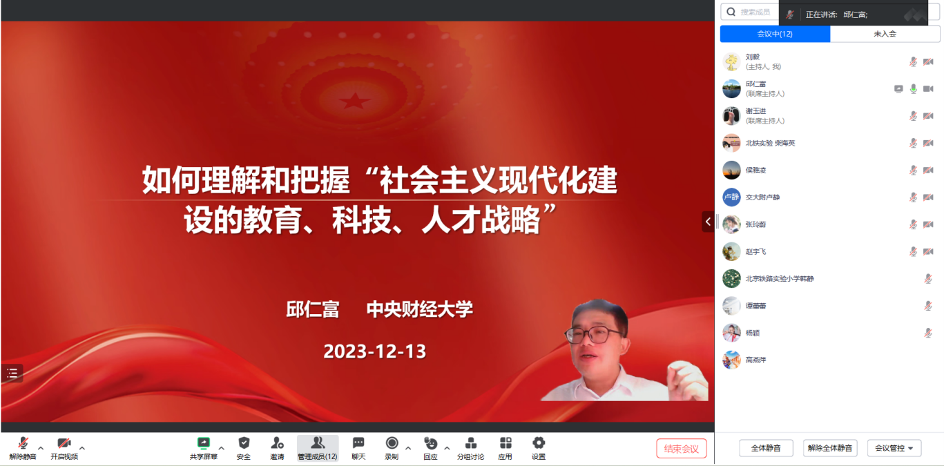 20231213日晚,今年会邱仁富教授在腾讯会议作题为如何理解和把握“社会主义现代化建设的教育、科技、人才战略”的“大中小学思政课”一体化专题辅导会。北京市五十七中、北京交通大学附属中学、中国农业科学院附属小学和北京市铁路实验小学等老师参加辅导会。专题辅导会由学院谢玉进副院长主持。